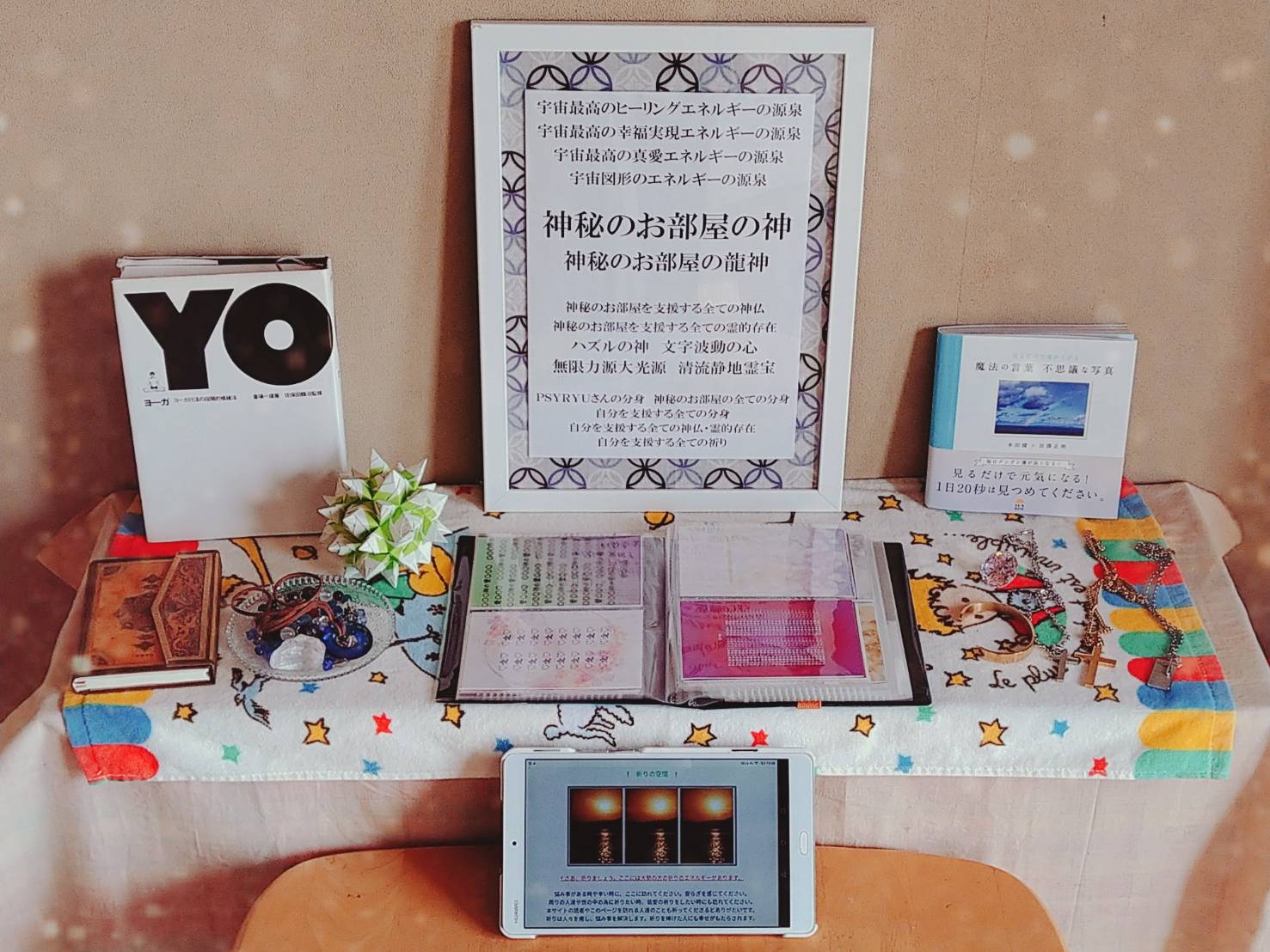 「神秘のお部屋の魔導書」や「浄化BOX」、波動を込めたグッズなどが置いてあります。