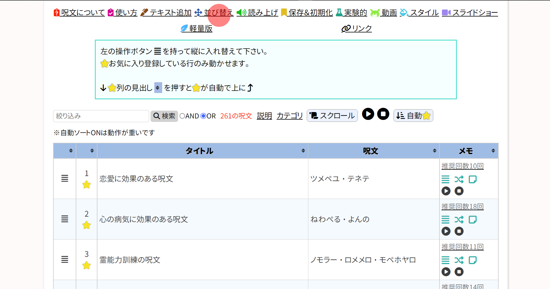 ひらがな呪文リスト:並び替えの修正 / 自動ソート調整