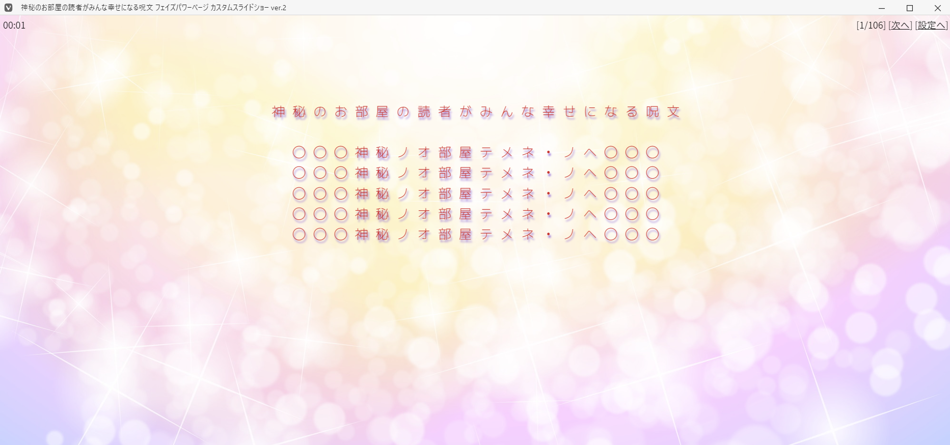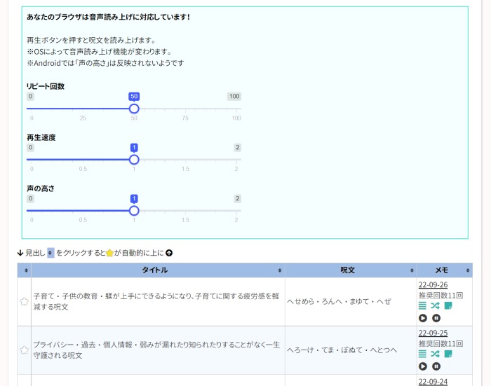 最初に「呪文のタイトル」を読み上げてからリピート回数分の呪文を読み上げてゆきます。