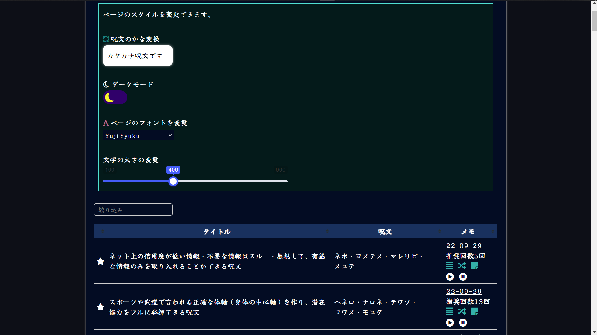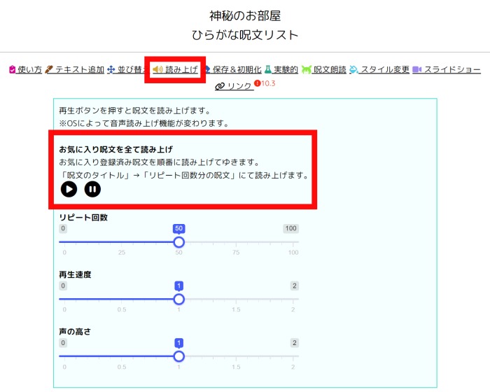 お気に入り登録済みの呪文を全て順番に読み上げてゆく機能が付きました。