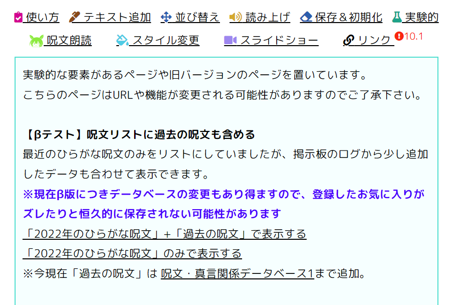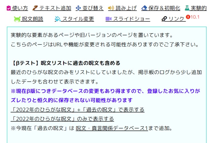 ひらがな呪文リスト:【β版】過去の呪文もリストに追加できる機能